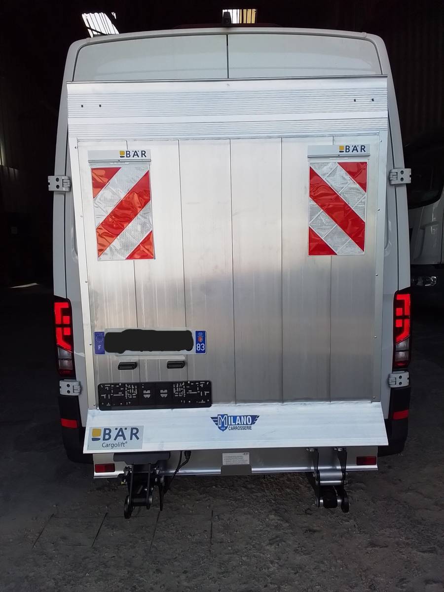 - Fourniture et pose d’un hayon élévateur 4 vérins de capacité 750 Kg avec une plateforme aluminium de 1250 x 1780 mm