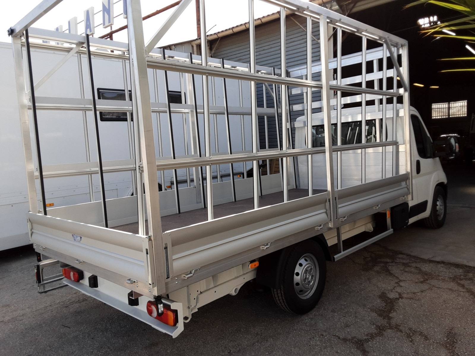 Fourniture de 2 ridelles aluminium anodisées Ht : 300 mm par cotés avec un rancher central fixe renforçant la poutre porteuse. Une ridelle aluminium amovible à l’arrière de 300 mm fermera le plateau.